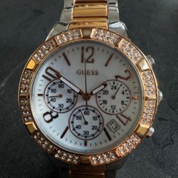 Guess dameur med sølvfarvet urkasse og funklende sten. Uret har en sølvfarvet urskive med flere funktioner og en matchende sølvfarvet armlænke.har fået ny batteri