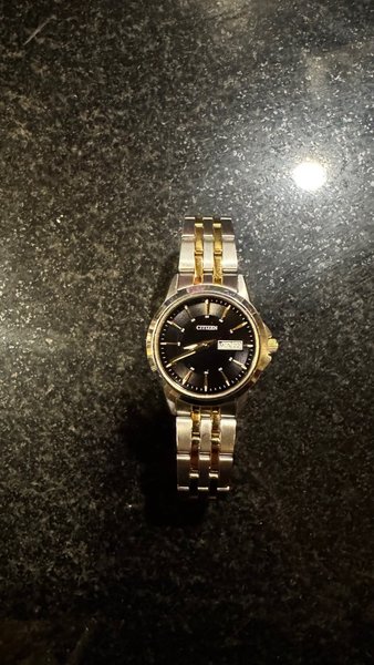 Citizen armbandsur med en svart urtavla och ett tvåfärgat armband. Klockan har en datumvisning. Använd fåtal tillfällen, batteriet behöver bytas