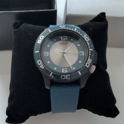 Denna distinkta klocka har en robust, bred manschettrem som möter en rektangulär silverfärgad boett. Urtavlan är ljus med tydliga siffror, och den unika designen gör klockan till en iögonfallande statement-accessoar.