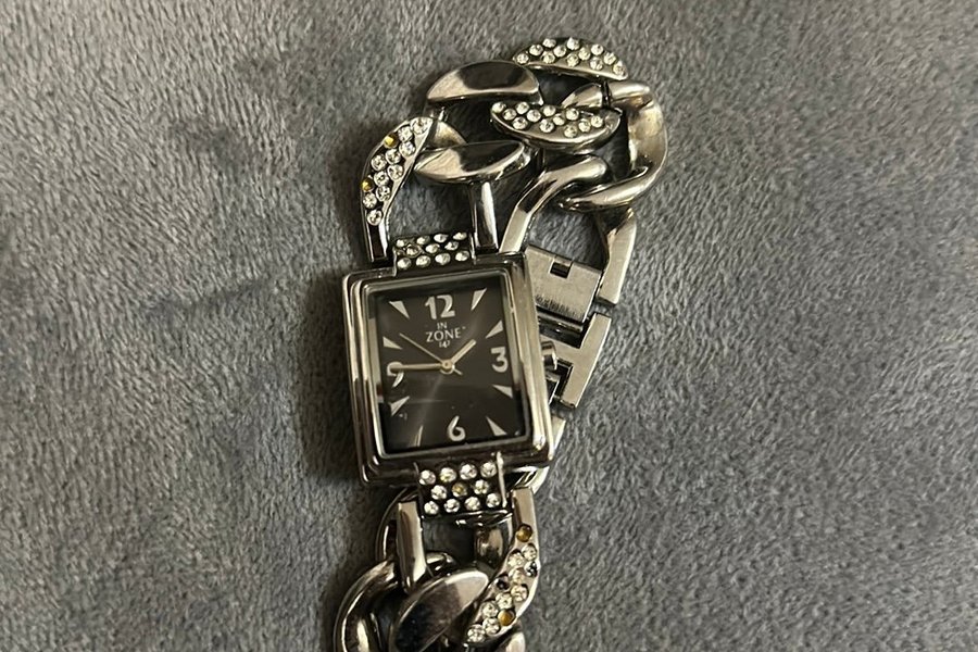 Elegant damklocka från In Zone med en stilren svart urtavla och ett unikt armband i form av en silverfärgad kedja, smyckad med strass. Perfekt för att addera en touch av glamour till din vardag.