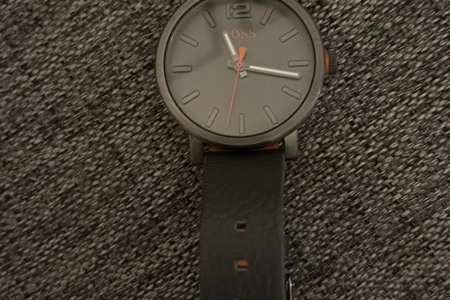 Snygg herrklocka från BOSS med en grå urtavla och ett svart läderarmband. Klockan har en minimalistisk design med orange detaljer.