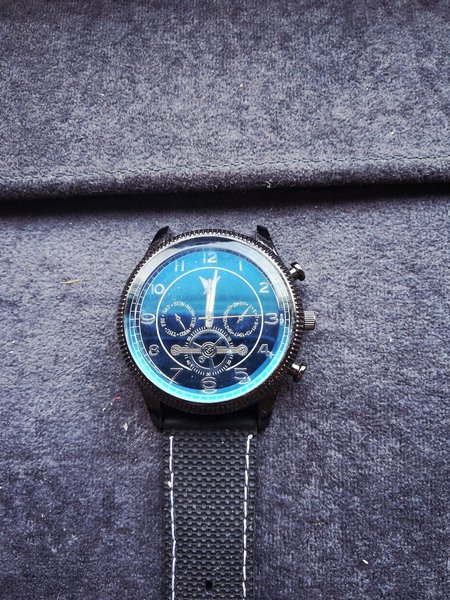 Snyggt armbandsur med blå urtavla och svart armband. Klockan har en detaljerad design med flera funktioner på urtavlan.