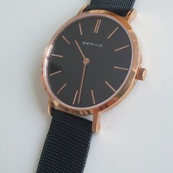 Elegant damklocka från Bering. Klockan har en svart urtavla med infattade stenar och ett keramiskt armband i svart och roséguld. Extralänk finns.