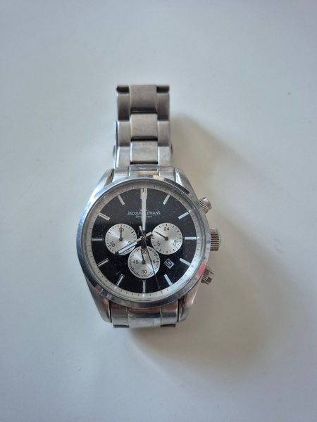 Säljer en Jacques Lemans Chronograph herrklocka med ett svart urtavla och tre sub-urtavlor. Klockan har ett quartz urverk och ett armband i rostfritt stål. Datumvisning finns vid klockan 4. Klockan är i gott skick med normalt slitage.