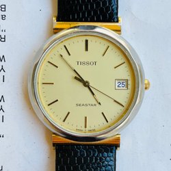 Tissot herrklocka med svart urtavla och guldfärgad. Klockan har ett svart läderarmband och datumsfönster. Klockan behöver ett batteribyte