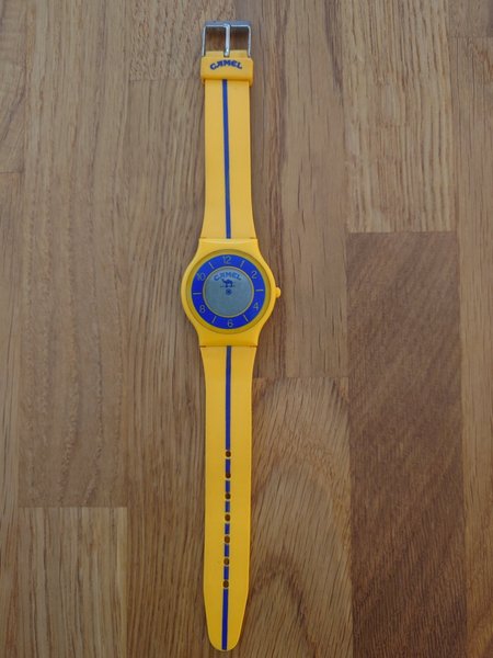 Vintage camelklocka med gult armband och blå detaljer. Ej funktionstestad, behöver nytt batteri.