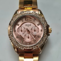Säljer en fin Regal damklocka. Klockan har en silverfärgad urtavla med strass runt boetten. Armbandet är tillverkat av metall.