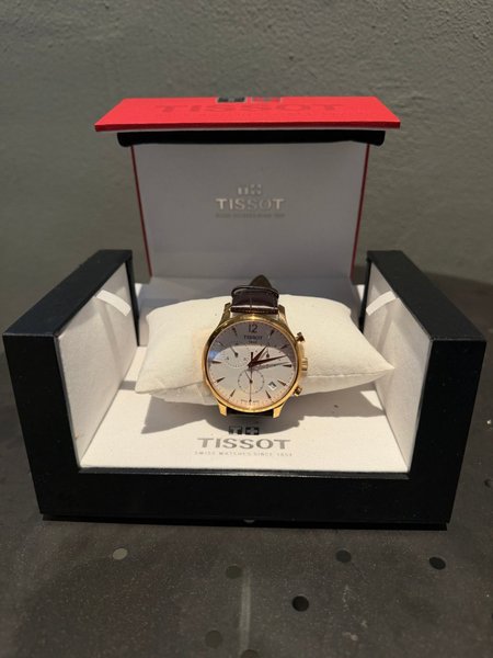 Tissot tradition chronograph, tillhörande box samt märke sitter kvar på klockans baksida med qr kod samt serienummer.