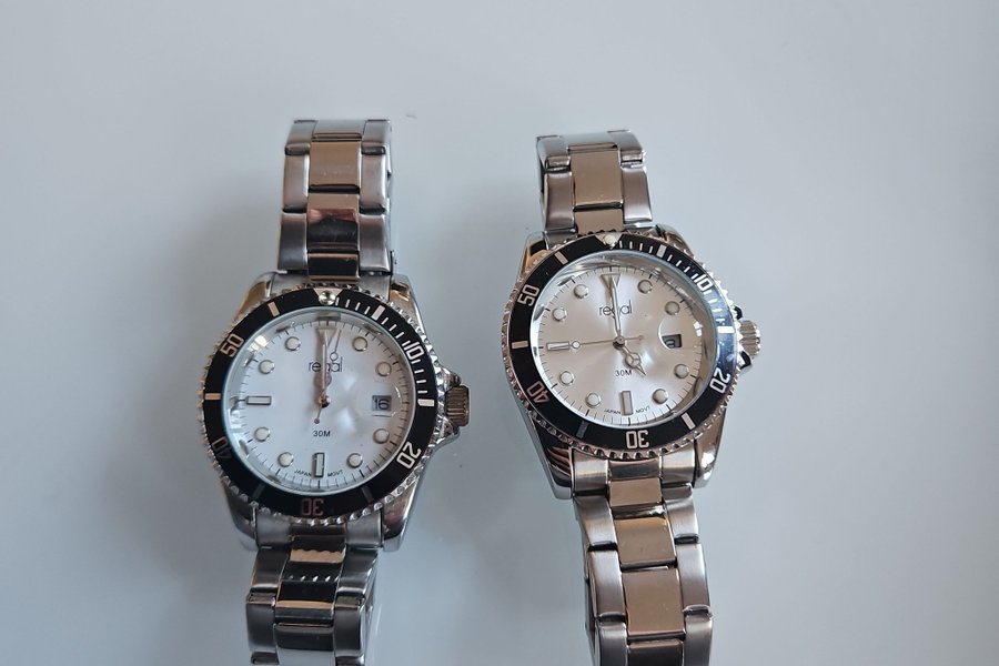 Två armbandsur från Regal med stållänk och vit urtavla. Klockorna har en sportig design med en svart bezel.