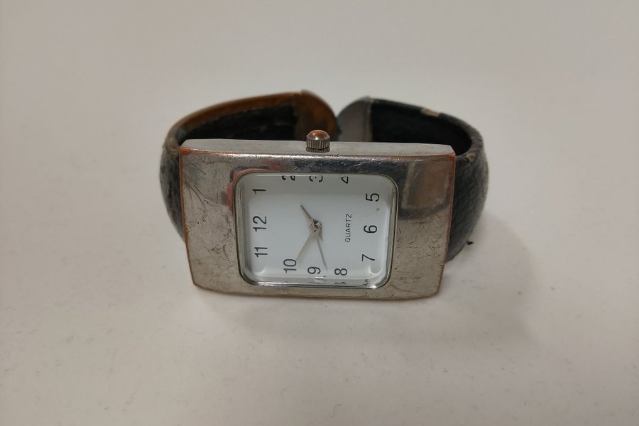 Denna distinkta klocka har en robust, bred manschettrem som möter en rektangulär silverfärgad boett. Urtavlan är ljus med tydliga siffror, och den unika designen gör klockan till en iögonfallande statement-accessoar.