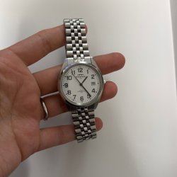 Armbandsur med vit urtavla. Klockan har datumvisning vid klockan 3. Boetten och armbandet är i metall.