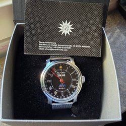 Jacques Richal Timemaster Chronograph med boett och armband i rostfritt stål. Klockan har ett quartzurverk och är vattentät till 10 ATM. Urtavlan är svart med tre sub-urtavlor och datumvisning. Visare och index är självlysande. Klockan levereras i en trälåda.
