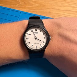 Casio Quartz klocka med analog och digital display. Klockan har ett svart hartsarmband och boett. Urtavlan är vit med svarta arabiska siffror. Klockan är vattentålig.
