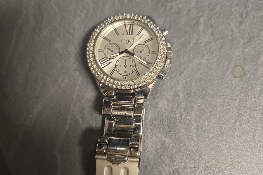 Säljer en Regal damklocka med strassinfattning runt urtavlan och silverfärgat armband. Klockan har flera små urtavlor inuti den stora.