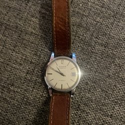 Digital klocka från Seiko. Klockan har ett brunt läderarmband och ett guldfärgat boett. Urtavlan visar tid, veckodag och datum. Funktioner inkluderar ljus, alarm, stoppur och varvtider.