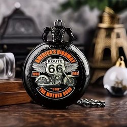 Svart fickur med guldfärgade detaljer. Urtavlan har romerska siffror och blå visare. Baksidan av uret har ett motiv. Diameter: 43 mm.