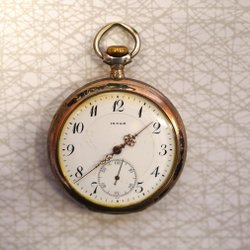 Ett vackert antikt fickur av märket Invar. Uret har en vit urtavla med svarta arabiska siffror och en liten sekundvisare. Boetten är dekorerad med medaljonger och text som indikerar utmärkelser från utställningar i Bryssel 1910 och Milano 1906. Urverket är mekaniskt och synligt när man öppnar boetten. Ett charmigt samlarobjekt.