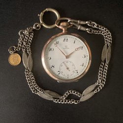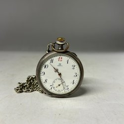 Ett vackert Omega fickur i silver. Uret har en detaljerad urtavla med en separat sekundvisare. Baksidan av boetten är graverad med ett dekorativt mönster och en tom vapensköld. Inuti boetten finns stämplar som indikerar 0.800 silverhalt, Omega-logotypen, FFBA och serienummer. Inre locket är graverat med "Omega Bienne Geneve" och en dedikation "På 50-års-årsdagen 19 2/9 44 av arbetsg. kamr.". Urverket är mekaniskt och synligt när man öppnar boetten.