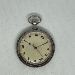 Klassiskt fickur med dekorativ urtavla och detaljerad baksida. Uret har romerska siffror och blå visare.