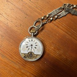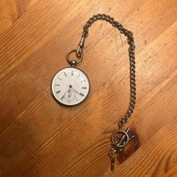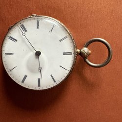 Ett antikt fickur med vit urtavla och svarta arabiska siffror. Urtavlan har en separat sekundvisare. Boetten är graverad på baksidan. Mekanisk urverk.