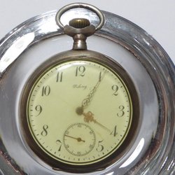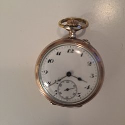 Ett fickur i silver. Uret är märkt "Cylindre 8 rubis" inuti boetten. Boetten är stämplad med "800" och serienummer "546886". Uret väger 73 gram.