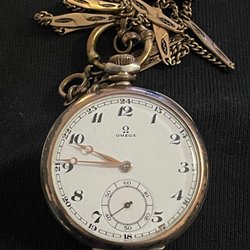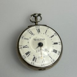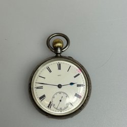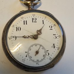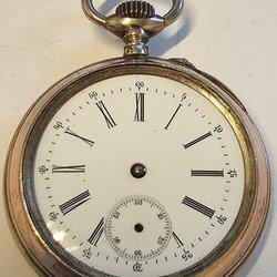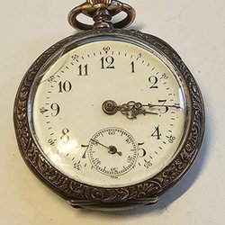 Ett fickur i silver. Uret har en vit urtavla med svarta siffror och en liten sekundvisare. Boetten är stämplad 0.800. Mekanisk urverk.