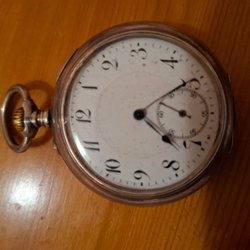 Ett antikt fickur. Boetten är tillverkad i metall. Urtavlan har arabiska siffror. Verket ser ut att vara mekaniskt.