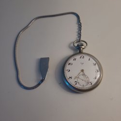 Ett vackert fickur med en detaljerad silverfärgad boett och kedja. Urtavlan har romerska siffror och ett dekorativt mönster i mitten. Perfekt som ett smycke eller en samlarobjekt.