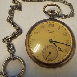 Fickur i silver med vit urtavla och arabiska siffror. Uret har en liten sekundvisare vid klockan 6. Boetten är i silver med ett mönstrat bakstycke. Urverket är synligt när boetten öppnas.