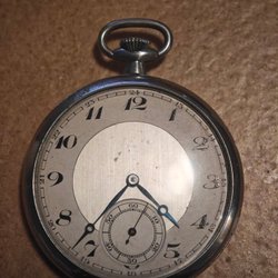 Ett fickur med en vit urtavla och svarta siffror. Urtavlan har en liten sekundvisare. Boetten är dekorerad med ett mönster och en sköld. Urverket är mekaniskt och märkt med "G.T". Inuti boetten finns stämplar, inklusive "0.800" och en krona.