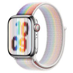 "Braided Solo Loop" i Pride-utförande väver samman Pride-flaggans färger och har en töjbar utformning som gör den bekväm och enkel att ta på och av.
