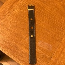 Svart klockarmband i läder med guldfärgat spänne. Armbandet har en elegant design och passar till bandbredd ca 18mm.