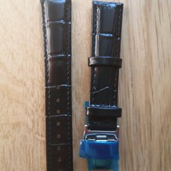Svart läderarmband från Vinstrap, 18mm brett men smalnar av "taper" ganska aggresivt vid spännet. Avsmalningen ger ett bekvämt bärande och exlusivt, något nättare intryck. Armbandet är tillverkat av äkta läder med vita sömmar och ett spänne i rostfritt stål. Verktyg för att byta armbandet får du med även om armbandet har QR quick release pins för att snabbt och verktygslöst byta klockarmband. (Bilder med Röd bakgrund är bredare men samma)