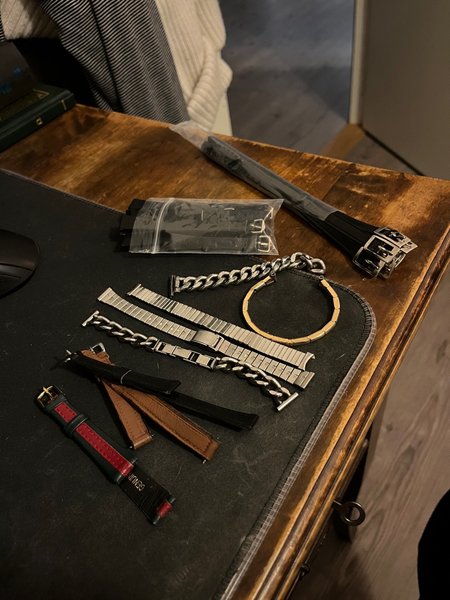 Ett set med diverse armband i olika stilar och material. Inkluderar läderarmband i olika bruna nyanser, ett rött och grönt läderarmband, samt metallarmband i silver och guld. Perfekt för att variera utseendet på din klocka.