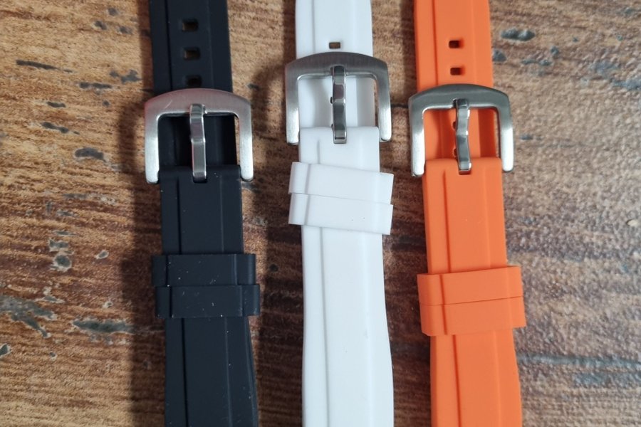 1 st 22mm gummiarmband med förhöjning i mitten, i Omega gummiarmbandstil passar till den typen av soprtiga klockor. Stiligt sportigt och passar även extra bra till sport, träningsklockor, flieger eller chronograf racing klockor. Tål svett, bad och dykning. Det är ett snyggt och bekvämt mellan mjukt, lagom inte så hårt att det skaver och inte sladdrigt armband som passar till de flesta tillfällen. Inga skarpa kanter.