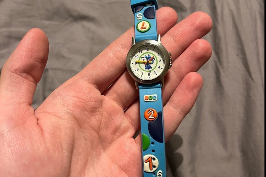 Söt barnklocka med blått armband dekorerat med siffror och figurer. Urtavlan har tydliga siffror och en rolig illustration i mitten. Perfekt för barn som lär sig klockan. Byte av batteri behövs.