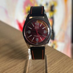 HMT Sona mekanisk klocka med ett laxröd mönstrat urtavla och guldfärgad boett. Klockan är manuell och har texten "WATER RESISTANT" och "SHOCK RESISTANT" på baksidan.