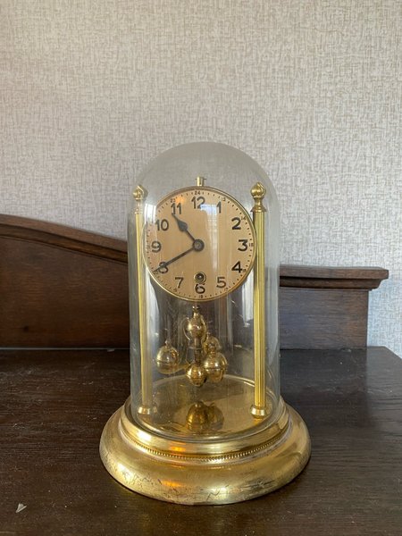 En klassisk bordsklocka med en elegant glaskupa. Klockan har en guldfärgad ram och en pendel med dekorativa kulor. Perfekt som en stilfull inredningsdetalj. Obs! Nyckel till urverk saknas!