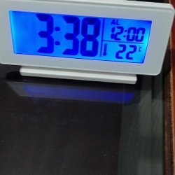 En digital väckarklocka som visar tid, datum och temperatur. alarmfunktion.