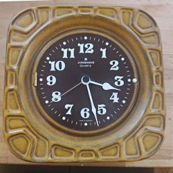 Junghans Repeat series liten väckarklocka, tillverkad i Tyskland. Den har en vit urtavla med tydliga siffror och en rektangulär form. På baksidan finns inställningsrattar och ett fack för batterier.