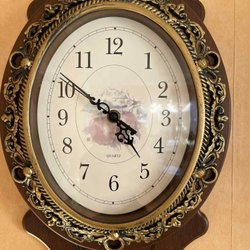 En charmig väggklocka med pendel. Denna klocka har en klassisk design med en träbakgrund och detaljer i mässingsfärg. Perfekt för att addera en vintage touch till ditt hem.