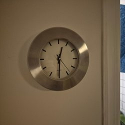 En stilren väggklocka som passar i de flesta rum. Den har en svart urtavla och silverfärgade detaljer.