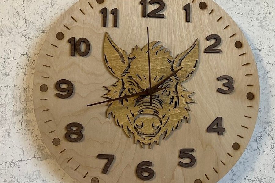 En unik väggklocka med ett vildsvin i mitten. Klockan har tydliga siffror och prickmarkeringar för varje minut.