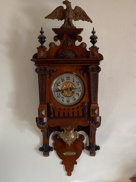 En vacker antik väggklocka med en detaljerad träkonstruktion och en örn på toppen. Klockan har en klassisk urtavla med tydliga siffror. Klockan fungerar inte så den behöver omtanke och fix.