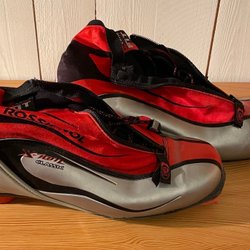 En röd väggklocka med silverfärgad ram. Urtavlan är röd med vita markeringar. Quartz urverk. Diameter 35cm