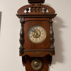 En väggklocka i trä. Den har en urtavla med siffror och en pendel.
