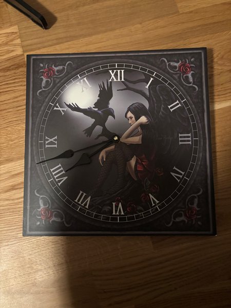 Klocka med gotiskt motiv. Batteriet behöver bytas. Fint skick. Kan hängas på väggen.