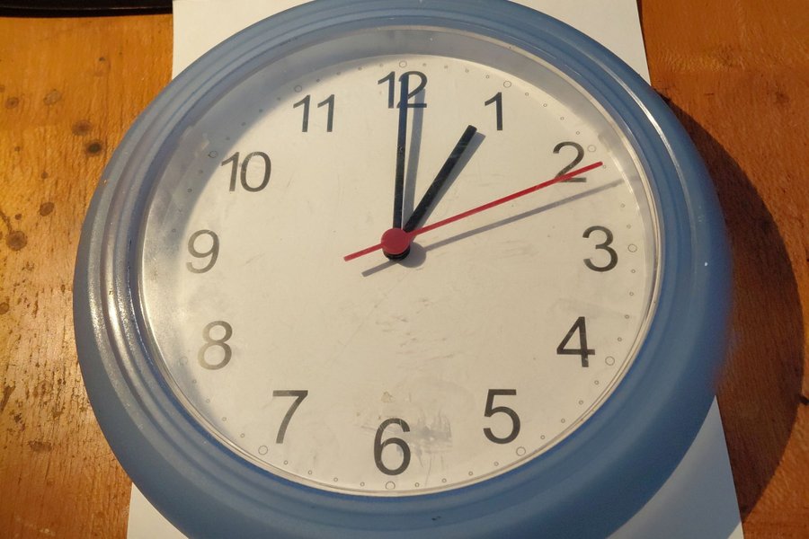 Väggklocka med blå ram och vit urtavla. Klockan har tydliga svarta siffror för timmar och minuter, samt svarta visare för timmar och minuter och en röd sekundvisare. Drivs av ett kvartsurverk.25 cm Frakt Schenker eller önskemål