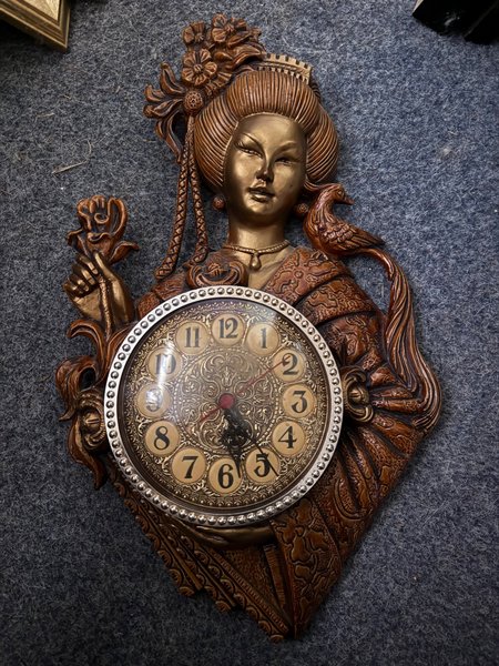 Väggklocka i asiatisk stil. Klockan är tillverkad av ett robust material som liknar brons eller koppar, med detaljerade utsmyckningar som föreställer en kvinna i traditionell klädsel, en fågel och blommor. Urtavlan har romerska siffror och en dekorativ design. Klockan är batteridriven.