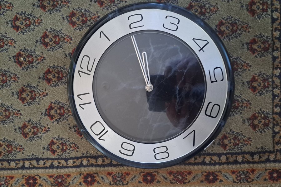 En stilren väggklocka som passar i de flesta rum. Den har en svart urtavla och silverfärgade detaljer.